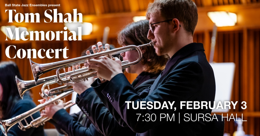 Enjoy a concert of standard jazz favorites and original compositions with the Ball State University Jazz Ensembles in honor of alum and trumpet player Tom Shah. The ensembles are under the direction of Mark Buselli.
