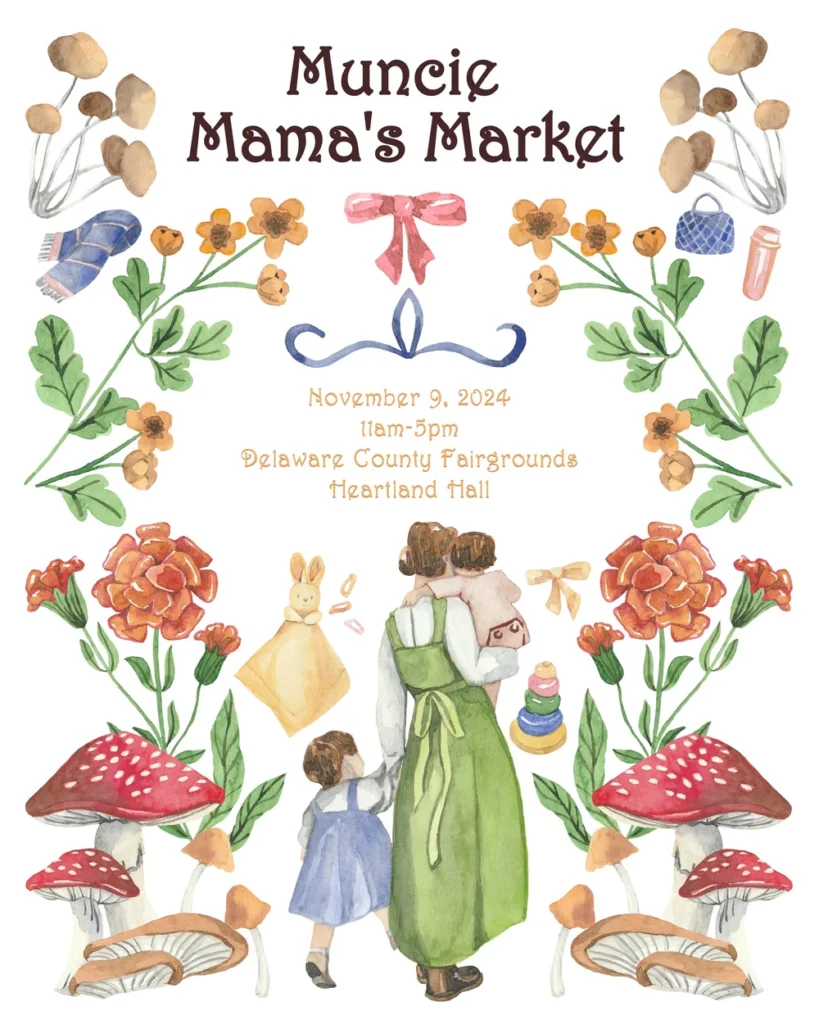 Here is a little sneak peek at what you have to look forward to when shopping at the Muncie Mama’s Market! Vendors will have handmade clothing, a Flower truck, permanent jewelry, crochet, dolls, lovies, accessories, bags, hat bar, hair tinsel, tea, fudge, cookies, cupcakes, cake pops, art, jewelry, charm bar, Christmas ornaments, prints, books, stickers, wooden toys, candles, blankets, Stanley toppers, Bogg-bag accessories, earrings, tumblers, skin products, clothing boutiques, swaddles, burp cloths, keychains, hair bows, mobiles, reusable towels, beanies, cocoa bombs, macrame items, plant hangers, room sprays, car diffusers, seasonings, custom cookies, headbands, stockings, houseplants, teethers, home decor, magnets, time capsule cards, handmade bags, bookmarks, pottery, keepsake boxes, greeting cards, dog collars, jam and jelly, up-cycled items, badge reels, laser made items, diy kits, Christmas gifts, lanyards, clutches and so much more!