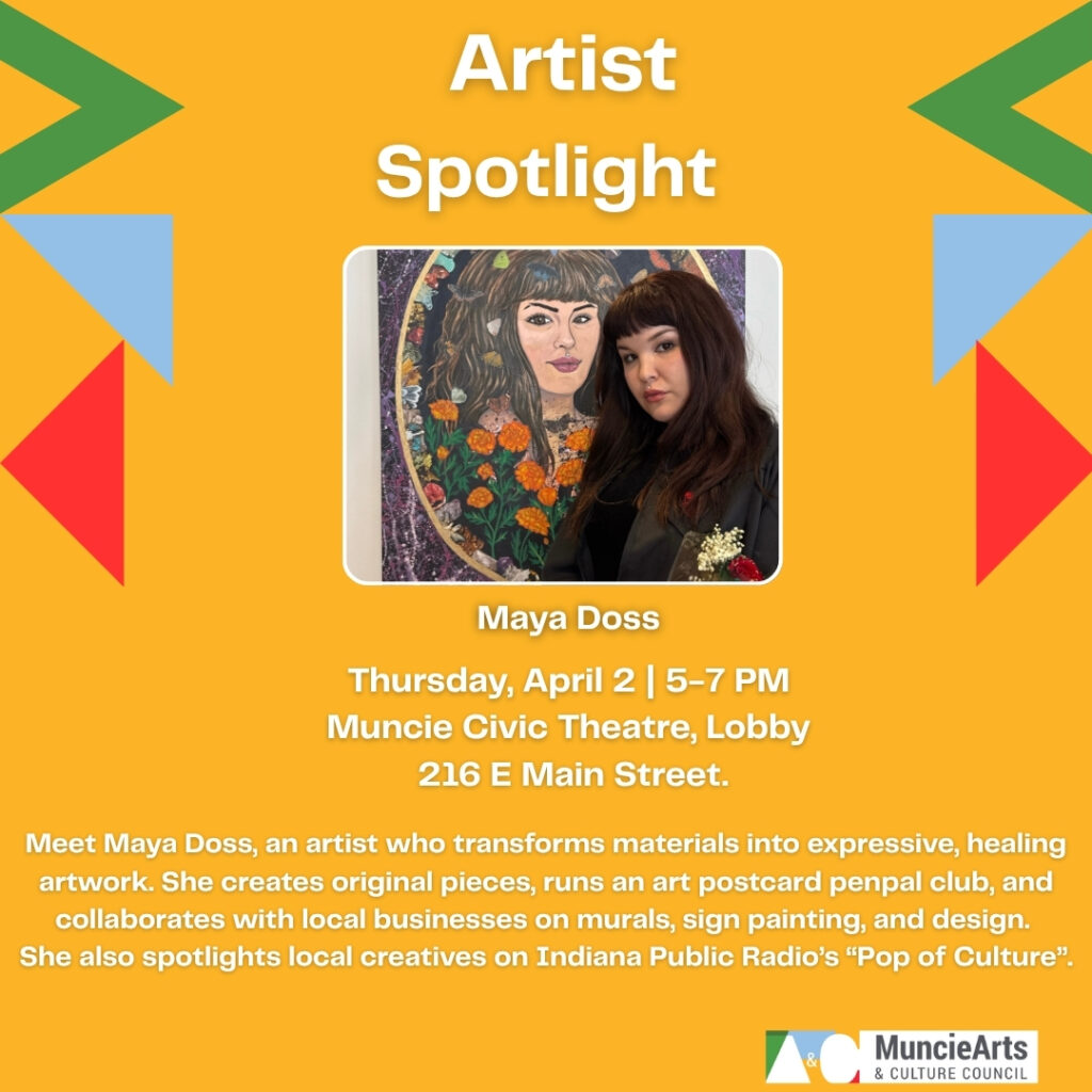 Join us for the MuncieArts Artist Spotlight, a monthly First Thursday event celebrating local art in Muncie. This month’s event will feature Maya Doss and will take place on Thursday, April 2 , from 5:00 – 7:00 PM at the Muncie Civic Theatre Lobby, 216 E. Main Street. Come have the opportunity to view Maya’s art works , meet the artist, and learn about his creative process.