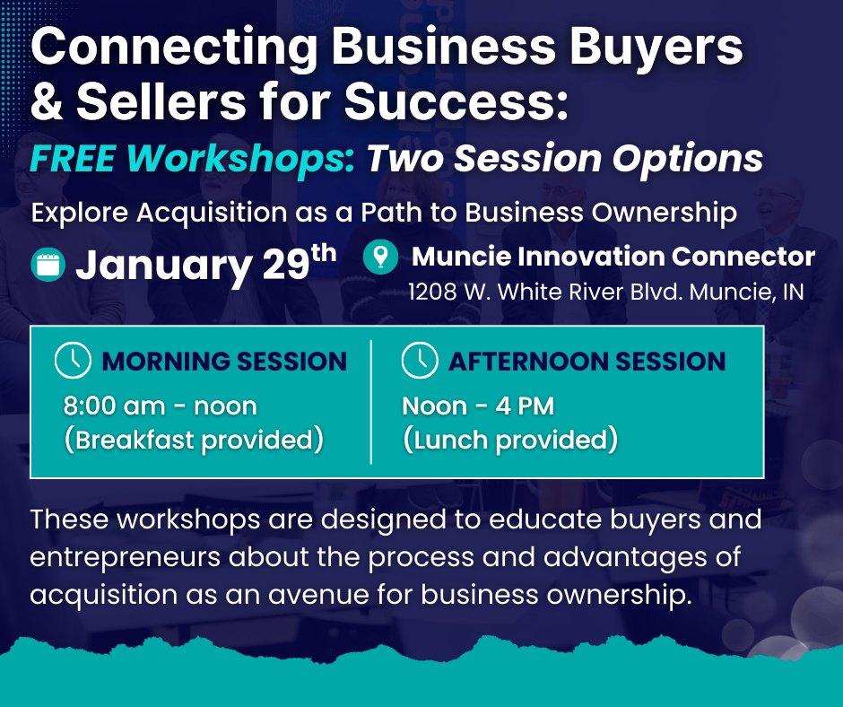 Innovation Connector 1208 W White River Blvd, Muncie, IN, United StatesExplore acquisition as a path to business ownership! This workshop aims to educate buyers and entrepreneurs about the process and benefits of acquisition as a path to business ownership. Choose what time works best for you! There will be two separate sessions that contain the same information. Breakfast and Lunch...