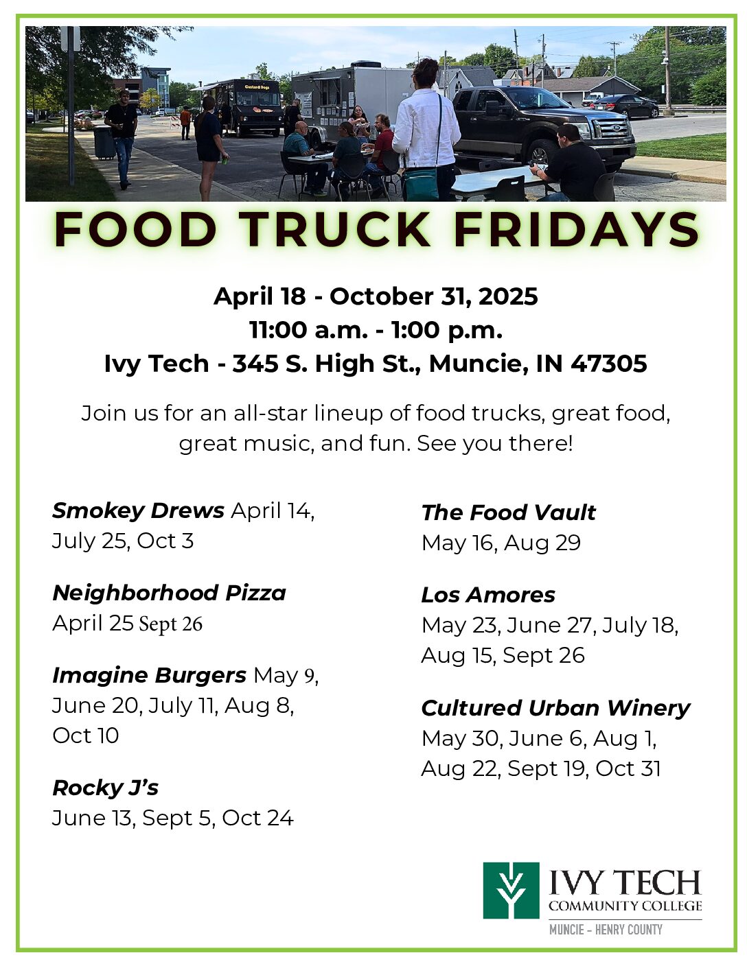 Ivy Tech - George & Frances Ball Building 125 S High St, Muncie, IN, United StatesJoin us for Food Truck Fridays at 345 S High St in Muncie by the Ivy Tech building Have a great lunch, great music and fun in your day starting Friday, April 18th thru October 31st The Food Truck Vendors will alternate, schedule is as follows ( and subject to...