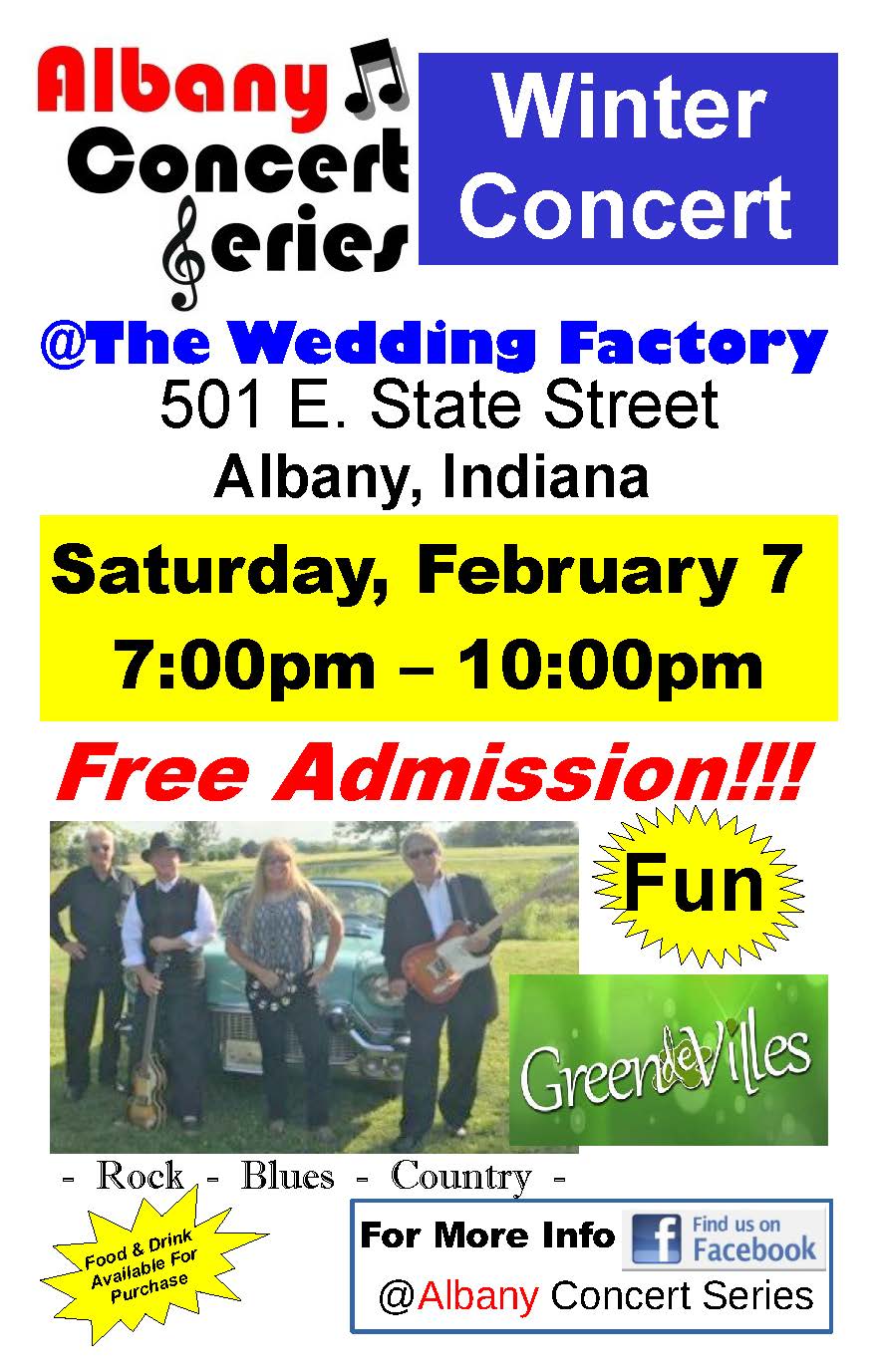 The Wedding Factory East State Street, Albany, IN, United StatesMark your calendars. We extend our Concert Series by hosting a FREE Winter Concert INDOORS at The Wedding Factory, right here in Albany, on Saturday, February 7, 2026 from 7:00pm to 10:00pm. The evening will feature food and drink options for purchase, a dance floor, and live music from Green...
